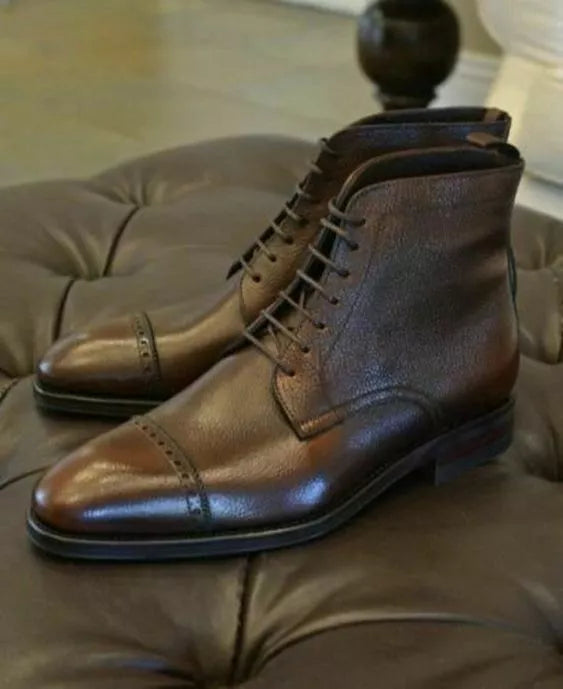 Handmade Men Brown Leather Brogue Ankle Boots, Hiking Jungle Boots, Biker Boots