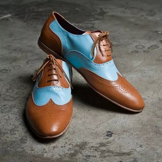 Handmade Men Tan & Blue Leather Wing Tip Brogue Shoes, Formal Lace Up Dress Shoes