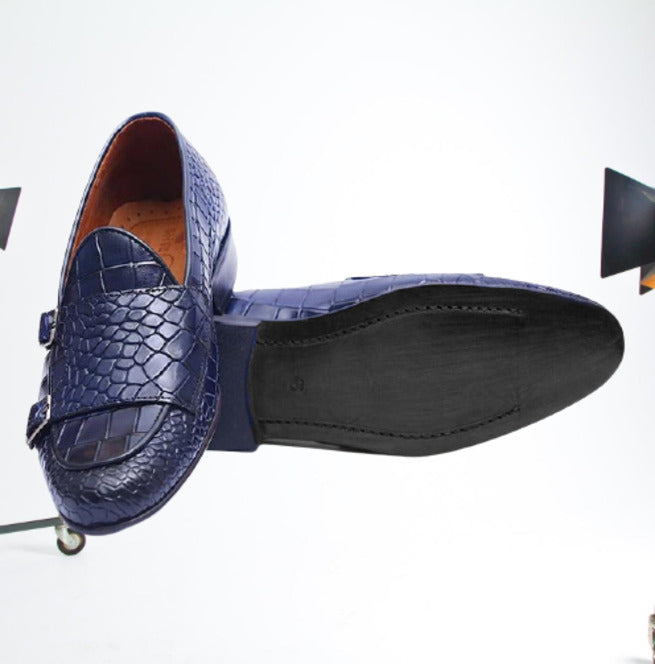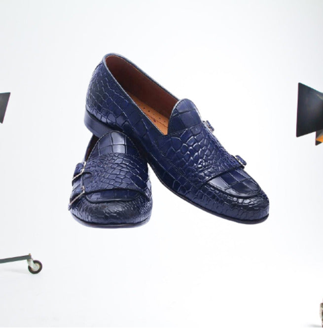 Handmade Mens Blue Crocodile Monk Shoes, Men Blue Loafer Shoes