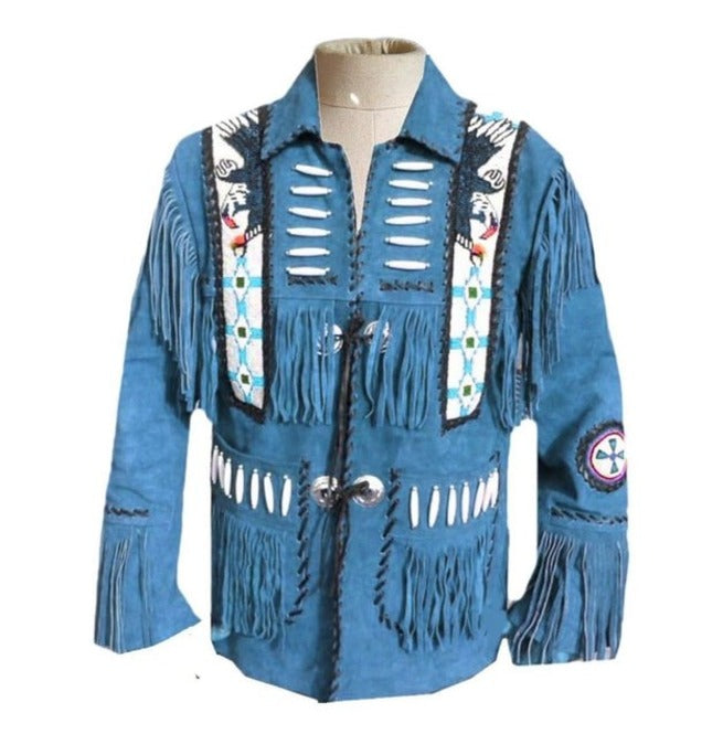 Men Western Leather Jacket Wear Fringes Beads American Cowboy Jacket