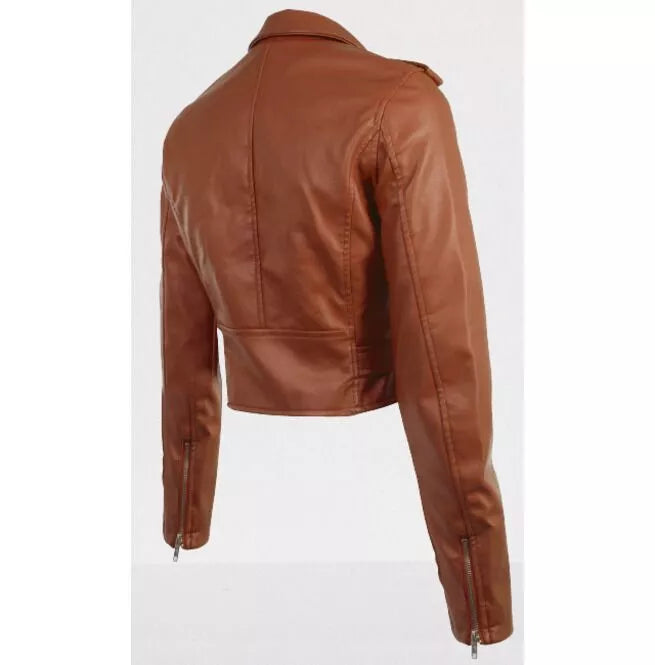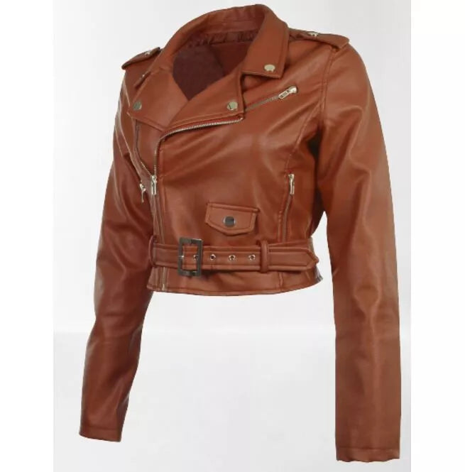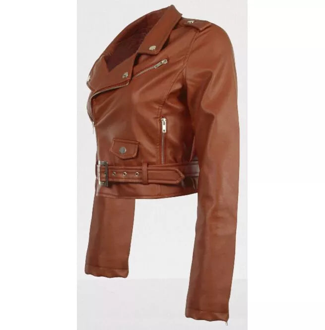 Women Brown Leather Cropped Biker Jacket, Cropped Belted Fashion Jacket